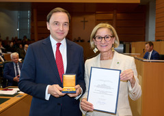 Am 7. Oktober wurde unserem Gründer und Obmann des Trägervereins der Schola Thomas Morus Trumau das Große goldene Ehrenzeichen für Verdienste um das Land Niederöstereich verliehen. Damit dankt Landeshauptfrau Mikl-Leitner allen „Menschen, die in ihrem Bereich, in ihrem Beruf und in ihren Funktionen mehr tun als ihre Pflicht“. Bei der Ehrenzeichen-Überreichung im Landtagssitzungssaal in St. Pölten wurden insgesamt 44 Ehrenzeichen übergeben: zwei Rettungsmedaillen des Bundeslandes Niederösterreich, 32 Ehrenzeichen für Verdienste um das Bundesland Niederösterreich, eine Ehrenmedaille des Landes Niederösterreich, sechs Berufstitel, ein Ehrenzeichen für Verdienste um die Republik Österreich und zwei Bundes-Ehrenzeichen (ausführlicher Pressebericht unter: https://www.ots.at/presseaussendung/OTS_20251007_OTS0146/ehrenzeichen-ueberreichung-im-noe-landhaus).