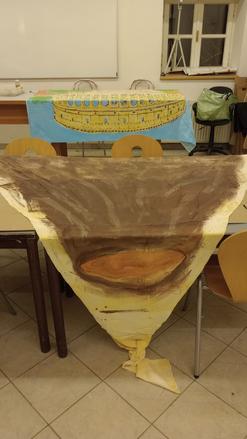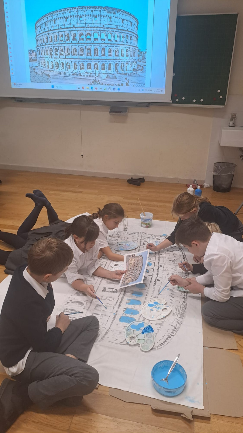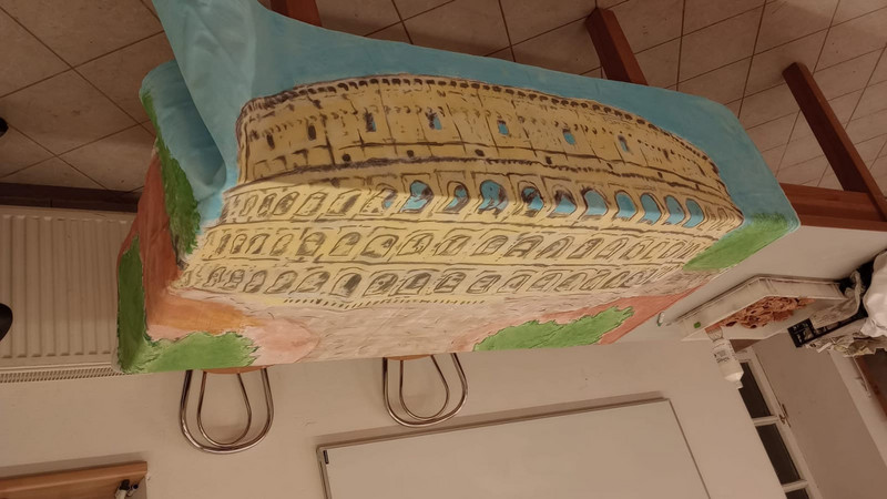 Die Bühnenbilder werden eigenhändig im Kunstunterricht gefertigt. Die 1. Klasse zeigte sehr viel Elan bei der originalgetreuen Abbildung des Kollosseums auf Leinwand.